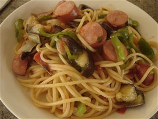 【写真:不思議な触感の茄子と粗引きソーセージの昔懐かし風ナポリタン】